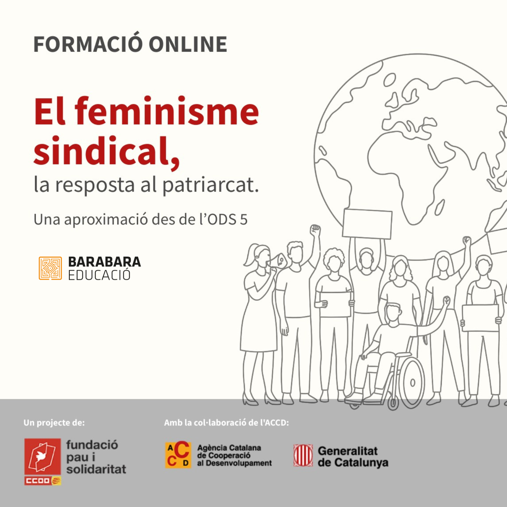 Aquesta formació virtual s’adreça a persones sindicalistes amb l’objectiu de fomentar una reflexió crítica i proporcionar eines per fer del feminisme sindical una estratègia clau en l’assoliment de l’Agenda 2030 i en la construcció d’un món laboral més just, equitatiu i sostenible.